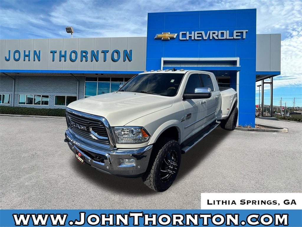 Priced below KBB Fair Purchase Price!Thank you for considering this beautiful 2018 Ram 3500 Laramie Longhorn finished in stunning Pearl White with Cattle Tan/Black Leather. GO WEST to John Thornton Chevrolet, Celebrating 60 Years, Selling Chevy since 1957! Thank you for your interest in John Thornton Chevrolet! We happily serve Lithia Springs, Douglasville, Smyrna, Marietta, Kennesaw, Viningâs, Atlanta, Dallas, Acworth, Villa Rica and proud to be your Chevrolet Dealer for all of West Georgia by providing quality automotive services and unrivaled customer service. Convenience Group, Protection Group, Quick Order Package 2FK Laramie Longhorn, 10 Speakers, 115V Auxiliary Power Outlet, 180 Amp Alternator, 220 Amp Alternator, 4-Wheel Disc Brakes, 4.10 Axle Ratio, 6000# Front Axle w/Hub Ext, ABS brakes, Adjustable pedals, Air Conditioning, Alloy wheels, AM/FM radio: SiriusXM, Apple CarPlay/Android Auto, Audio memory, Auto-dimming Rear-View mirror, Automatic temperature control, Box & Rear Fender Clearance Lamps, Brake assist, Bucket Seats, Center Hub, Chrome Bodyside Molding, Chrome Tubular Side Steps, Clearance Lamps, Compass, Delay-off headlights, Driver door bin, Driver vanity mirror, Dual front impact airbags, Dual front side impact airbags, Dual Rear Wheel Fender Flare Tracking, Dual Rear Wheels, Electronic Stability Control, Electronically Controlled Throttle, Emergency communication system: SiriusXM Guardian, Front anti-roll bar, Front Bucket Seats, Front Center Armrest w/Storage, Front dual zone A/C, Front fog lights, Front reading lights, Fully automatic headlights, Garage door transmitter, Genuine wood console insert, Genuine wood dashboard insert, Genuine wood door panel insert, Heated door mirrors, Heated Front Seats, Heated front seats, Heated rear seats, Heated Second Row Seats, Heated steering wheel, Hemi Badge, High Back Seats, Illuminated entry, Keyless Enter-N-Go, Leather steering wheel, Low tire pressure warning, Memory seat, Navigation System, Next Generation Engine Controller, Occupant sensing airbag, Outside temperature display, Overhead airbag, Overhead console, Panic alarm, ParkView Rear Back-Up Camera, Passenger door bin, Passenger vanity mirror, Pedal memory, Power 10-Way Memory Driver & 6-Way Passenger Seats, Power door mirrors, Power driver seat, Power Lumbar Adjust, Power passenger seat, Power steering, Power Sunroof, Power windows, Premium Filigree Leather Seats, Radio data system, Radio: Uconnect 4C Nav w/8.4 Display, Rear 60/40 Split Folding Seat, Rear reading lights, Rear seat center armrest, Rear step bumper, Rear Window Defroster, Remote keyless entry, Security system, Speed control, Split folding rear seat, Steering wheel mounted audio controls, Tachometer, Tilt steering wheel, Tip Start, Tire Pressure Monitoring Delete, Traction control, Trailer Brake Control, Trip computer, Turn signal indicator mirrors, Variably intermittent wipers, Vendor Painted Cargo Box Tracking, Ventilated Front Seats, Ventilated front seats, Voltmeter, Wheels: 17 x 6.0 Premium Aluminum, and Wheels: 18 x 8.0 Aluminum w/Walnut Pockets.